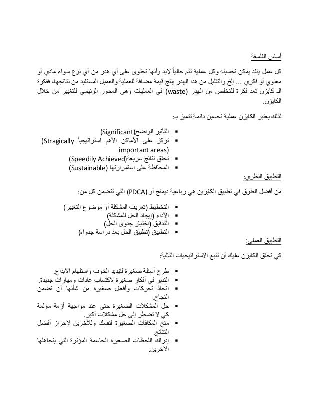- 2. الفلسفة أساس أو مادي سواء نوع أي من هدر أي على تحتوى وأنها البد ًاحالي تتم عملية وكل تحسينه يمكن ينفذ عمل كل ا والعميل للعملية مضافة قيمة ينتج الهدر هذا من والتقليل إلخ ... فكري أو معنويففكرة ،نتائجها من لمستفيد ( الهدر من للتخلص فكرة تعد كايزن الـwasteخالل من للتغيير الرئيسي المحور وهي العمليات في ) .الكايزن بـ تتميز دائمة تحسين عملية الكايزن يعتبر لذلك: الواضح التأثير(Significant) ًااستراتيجي األهم األماكن على تركز(Stragically important areas) سريعة نتائج تحقق(Speedily Achieved) ( استمرارتها على المحافظةSustainable) النظري التطبيق: أو ديمنج رباعية هي الكايزين تطبيق في الطرق أفضل من(PDCA)من كل تتضمن التي: التغيير موضوع أو المشكلة (تعريف التخطيط) للمشكلة الحل (إيجاد األداء) الحل جدوى (اختبار التدقيق) )جدواه دراسة بعد الحل (تطبيق التطبيق العملي التطبيق: التالية االستراتيجيات تتبع أن عليك الكايزن تحقق كي: االبداع واستلهام الخوف لتيديد صغيرة أسئلة طرح. جديدة ومهارات عادات الكتساب صغيرة أفكار في التدبر. صغيرة وأفعال تحركات اتخاذتضمن أن شأنها من النجاح. مؤلمة أزمة مواجهة عند حتى الصغيرة المشكالت حل أكبر مشكالت حل إلى تضطر ال كي. أفضل إلحراز ولآلخرين لنفسك الصغيرة المكافآت منح النتائج. يتجاهلها التي المؤثرة الحاسمة الصغيرة اللحظات إدراك .االخرين