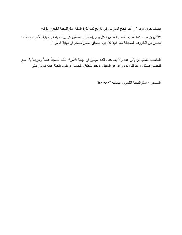 - 3. ف المدربين أنجح أحد , "وودن جون يصفبقوله الكايزن استراتيجية السلة كرة لعبة تاريخ ي: "وعندما ، األمر نهاية فى المهام كبرى ستحقق بإستمرار يوم كل صغيرا تحسينا تضيف عندما هو الكايزن األمر نهاية فى ضخم تحسن ستحقق يوم كل قليال ًاشئ المحيطة الظروف من تحسن". غد بعد وال غدا يأتى لن العظيم المكسبأسع بل ًاوسريع ًالهائ ًاتحسين تنشد األمرال نهاية فى سيأتى لكنه ـ ويبقى يدوم فإنه يتحقق وعندما التحسين لتحقيق الوحيد السبيل هو وهذا يوم لكل واحد ضئيل لتحسين " اليابانية الكايزن استراتيجية : المصدرKaizen"مدخل التطوير المستمر.ppt